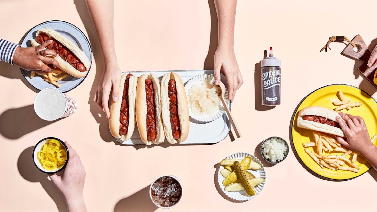 Different types of dogs are available, and these are served on a squishy baguette topped with dill pickle segments, kraut, vegetables, and a handful of additional condiments.
